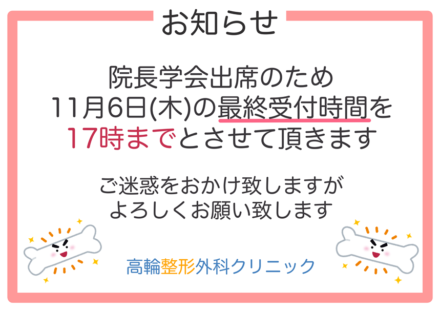 2025年10月20日 11月6日(木)診療受付時間変更のお知らせ Share EmailXFacebookPinterestLinkedinVkontakte 11月6日木曜日、院長学会出席のため最終受付時間を17時とさせて頂きます。 患者様にはご迷惑をお掛けしますが、ご理解の程よろしくお願いいたします。 2025年10月20日 お知らせ
