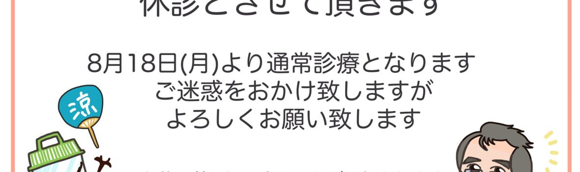 年末年始の診療につきましては以下とさせていただきます。 2025年12月28日(日)~2026年1月4日(日)まで休診となります。 新年は1月5日(月)より通常通り診療致します。 患者様にはご迷惑をおかけしますがよろしく […]