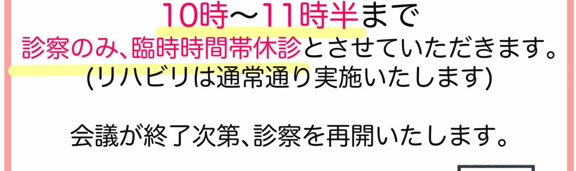 院長緊急会議出席のため、8月29日金曜日、午前10時~11時30分まで、診察のみ臨時時間帯休診とさせていただきます。 リハビリは通常通り実施いたします。 会議が終了次第、診察を再開いたします。 患者様にはご迷惑をおかけい […]