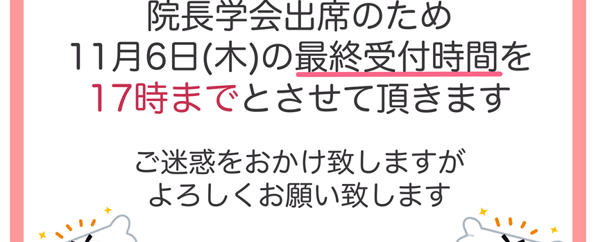 11月6日木曜日、院長学会出席のため最終受付時間を17時とさせて頂きます。 患者様にはご迷惑をお掛けしますが、ご理解の程よろしくお願いいたします。