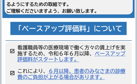 院内にも掲示してある通り当院でも令和8年3月1日より、医療現場で働く従業員の賃上げを実施するためのベースアップ評価料がスタートすることとなりました。 これにより、3月以降、患者の皆様の診療費のご負担が上る場合がございます […]