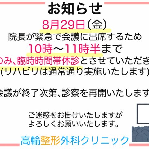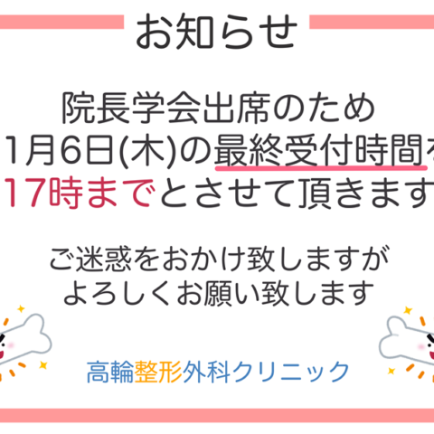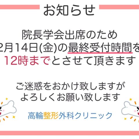 年末年始の診療につきましては以下とさせていただきます。 2025年12月28日(日)~2026年1月4日(日)まで休診となります。 新年は1月5日(月)より通常通り診療致します。 患者様にはご迷惑をおかけしますがよろしく […]