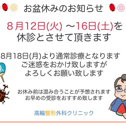 8月12日(火)~8月16日(土)まで休診とさせて頂きます。 8月18日(月)~通常診療となります。 患者様にはご迷惑をお掛けしますが、ご理解の程よろしくお願いいたします。