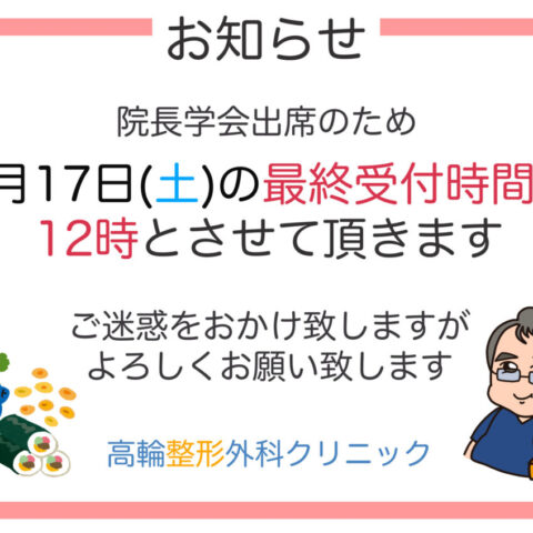 来る、6月15日土曜日は院長が研究会出席のため12時が最終受付となります。 なお、リハビリは通常通り13時最終受付となります。 患者様にはご迷惑をお掛けしますが、ご理解の程よろしくお願いいたします。